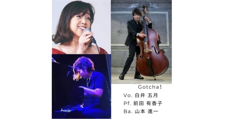 白井五月(Vo)、前田有香子(Pf)、山本進一(B) ピアノとベースとのトリオでシンプルでアコースティックなサウンドをお楽しみください。私たちを見つけてくださいね。